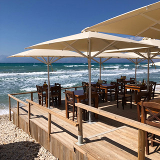 Ein wunderschöner Nachmittagsspaziergang führte uns bis nach Roda, etwa 3 km weiter am Strand entlang. Der Ort ist fest in britischer Hand - das fällt sofort auf, besonders an den Speisekarten. Aber nette Läden und attraktive Strände. Der Wind war schon ganz ordentlich und so waren wir froh, in einem kleinen Café etwas windgeschützt unseren Frappé trinken zu können. Ich liebe diesen kalten Kaffee in Griechenland! Beim Blick zurück stellten wir fest, dass wir in Acharavi die schönere Aussicht haben von unserem Balkon: Nicht nur die albanischen Berge übers Meer, sondern auch ein Stück Horizont, dass uns die Rundung der Weltkugel andeutet und für viele Träume Platz läßt.